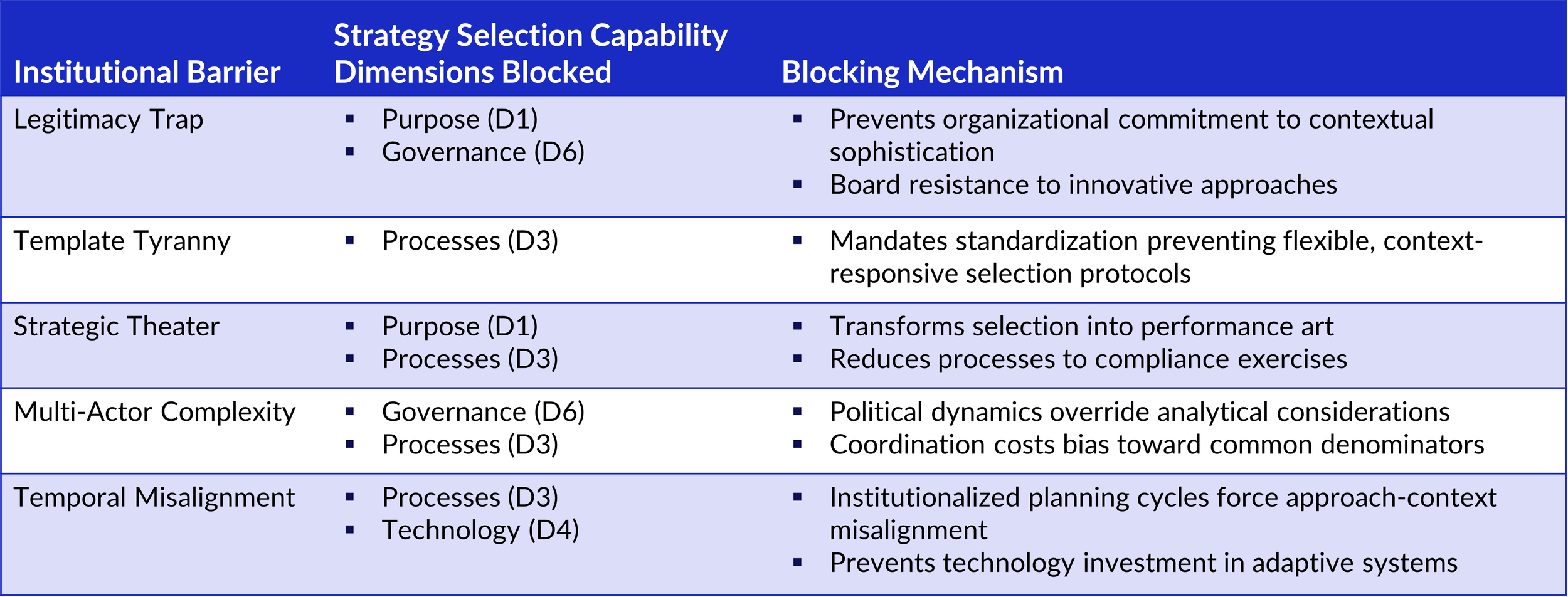Understanding these institutional barriers is crucial because they represent the final frontier in closing the Strategy Gap. Organizations that successfully navigate cognitive biases and acquire comprehensive strategy knowledge still fail if they cannot overcome the institutional cage that constrains strategy approach selection. As established in Part 3, these Level 3 barriers specifically block four critical dimensions of Strategy Approach Selection Capability: Purpose (Dimension 1), Processes (Dimension 3), Governance (Dimension 6), and Technology (Dimension 4).