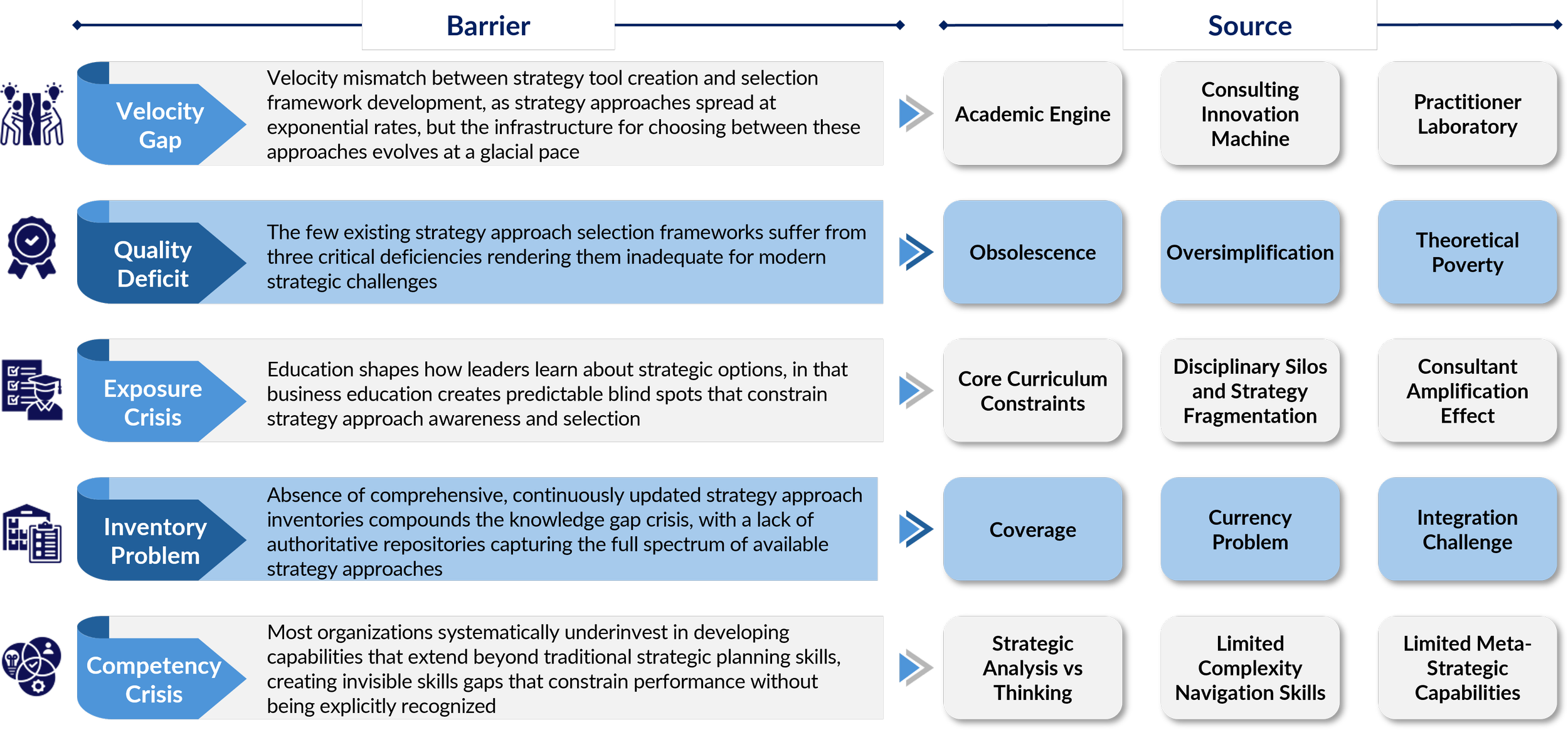 Finally, the competency crisis is a critical knowledge barrier which arises because modern strategy requires skills rarely taught in business schools: navigating uncertainty, experimenting, adapting dynamically, and mastering meta-strategic thinking, which is the ability to think about thinking about strategy.