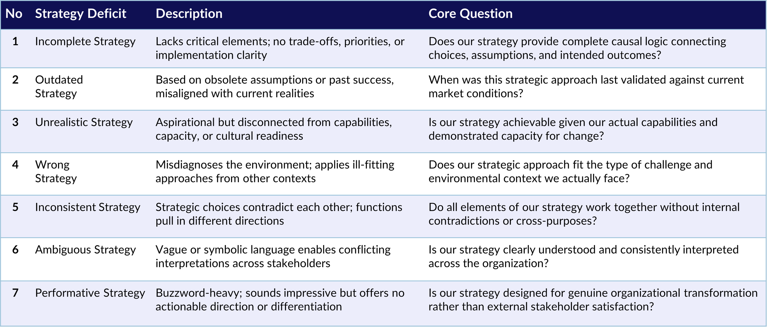 Strategic dysfunction rarely arises by accident. It follows predictable patterns that undermine effectiveness before implementation even begins. I define these as the 7 Strategy Deficits: incomplete strategy, outdated strategy, unrealistic strategy, wrong strategy, inconsistent strategy, ambiguous strategy, and performative strategy. These deficits fall into two main categories and are described in Table 1: